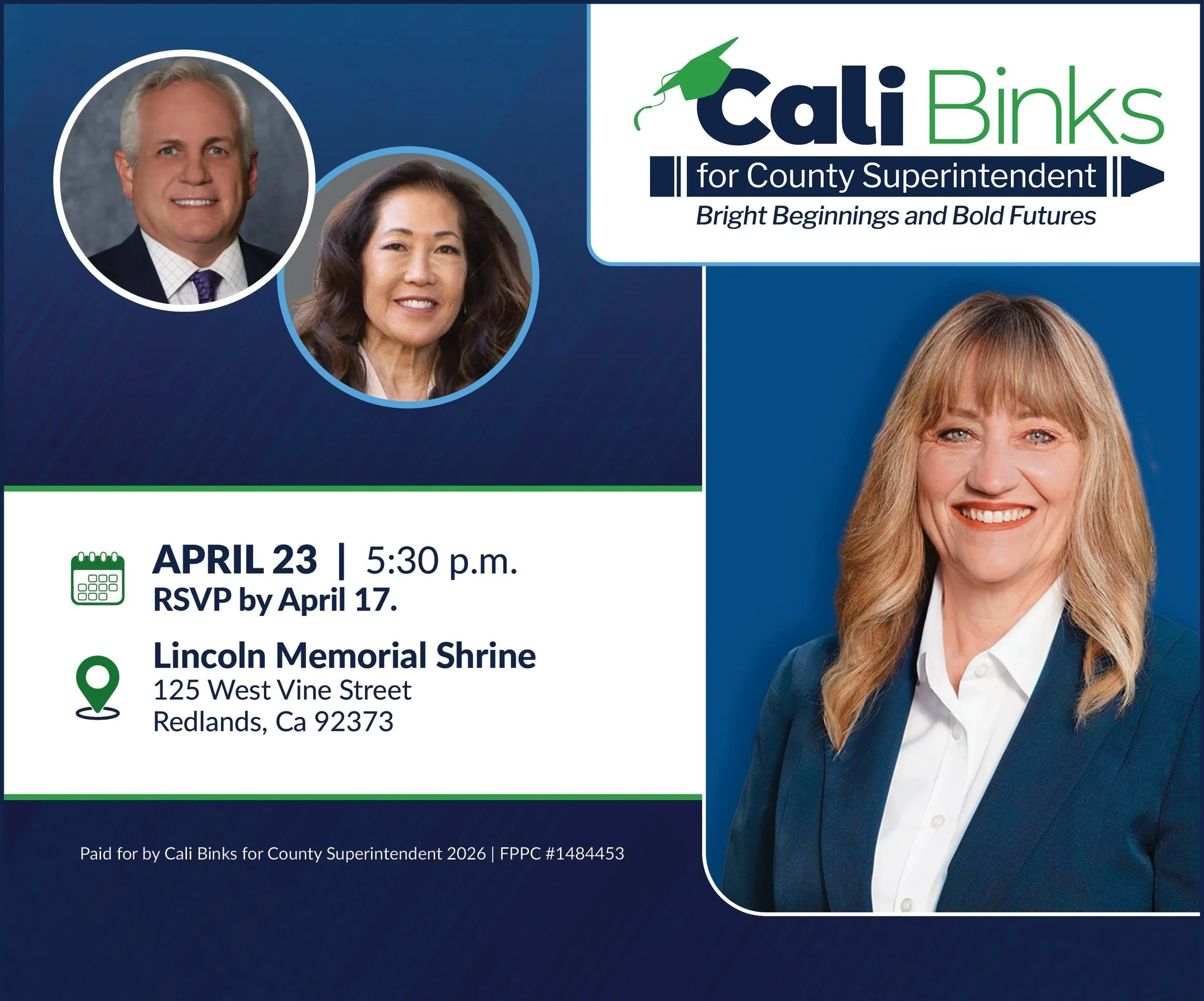 Join us for a fundraiser supporting our candidate Cali Binks, hosted by Neal Waner, a 13-year Redlands Unified School District Trustee and former Board President, current Board Member at Redlands Community Hospital and Executive Committee Trustee with SBCERA, alongside Joyce Waner, a member of the LLUCH Foundation Board of Directors and 2nd Vice President of the Bonnes Meres Children’s Fund Executive Board.