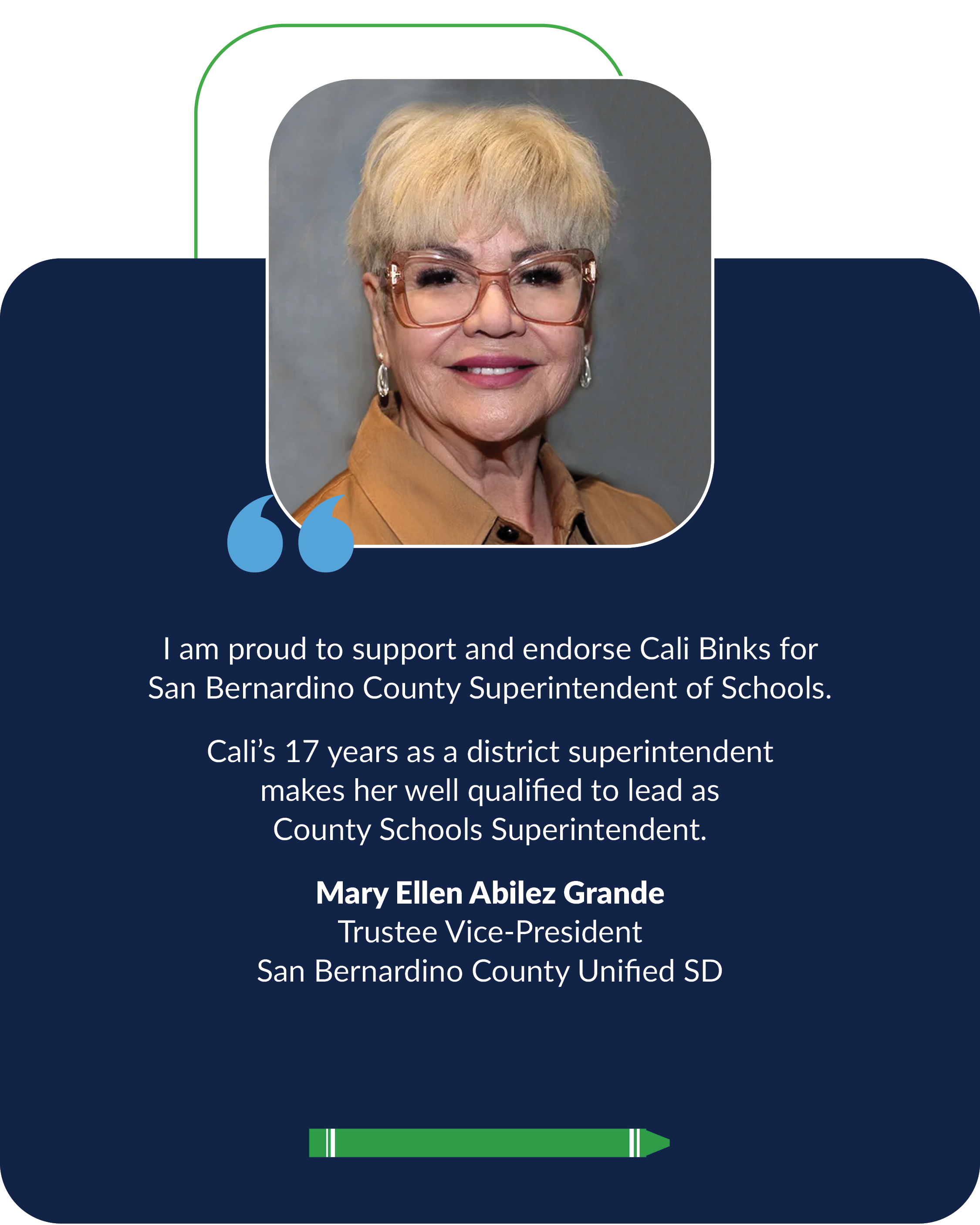 "I’m proud to endorse Cali Binks for San Bernardino County School Superintendent. Her proven leadership, commitment to students, and dedication to educational excellence make her the right choice to move our schools forward."